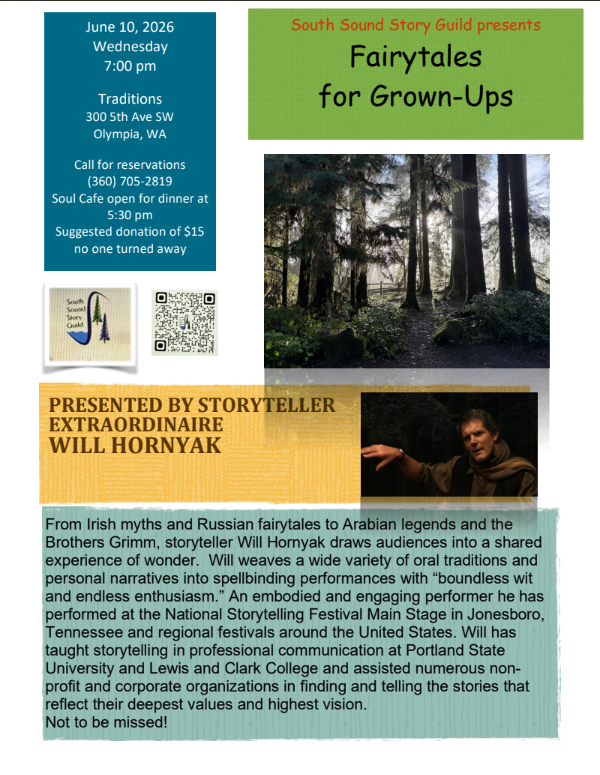 South Sound Story Guild invites the public to hear master storytellers, Eva Abrams from Seattle and Olympia’s Tobey Ishii Anderson, tell magical stories based on horses in the Asian oral tradition. In the second hour, Story Swap includes stories from the audience who share stories for 8 minutes.
