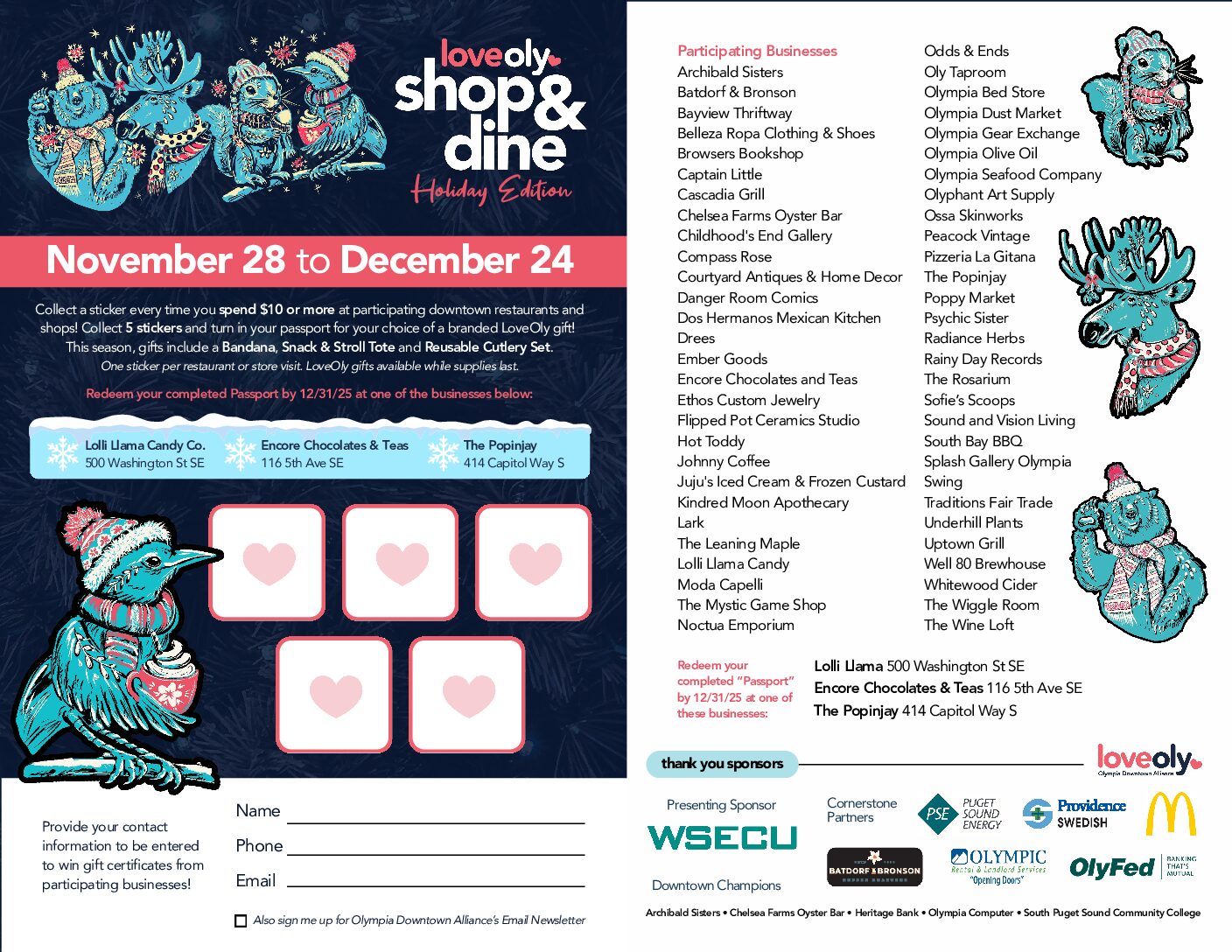 Bundle up, grab a warm drink, and discover your new favorite gift spot during LoveOly Shop & Dine – Holiday Edition (Nov. 28–Dec. 24). Collect a sticker for every $10 spent downtown and redeem them for special LoveOly branded gifts! Learn more here.